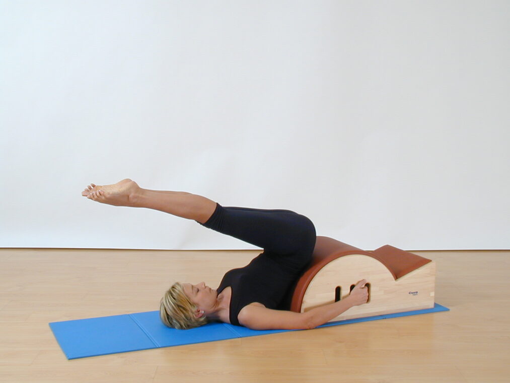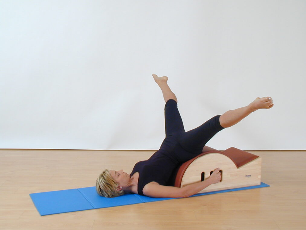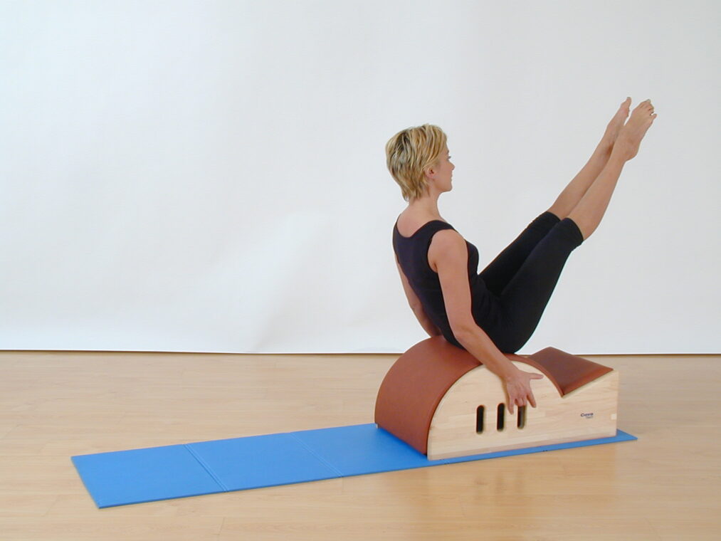 La posizione di partenza è supina, con il tratto lombare della schiena sulla parte semicilindrica della Step barrel e spalle e testa aderenti al suolo. Inserite le mani nelle fessure poste sui lati dell’attrezzo, per stabilizzare meglio il corpo e mantenere la corretta postura. Espirando, portate le gambe, unite e tese, verso il busto, senza staccare dalla Barrel la parte inferiore della schiena. Divaricate le gambe ed estendetele gradualmente, inspirando e disegnando un grosso cerchio che vi porti a unirle di nuovo (quando arrivano in posizione di massima estensione avanti). Contemporaneamente sollevate il busto e sedetevi sulla Barrel, espirando e assumendo da posizione del Teaser. Inspirate mantenendo la posizione, poi scendete lentamente alla posizione di partenza, espirando. Ripetete il tutto 3 volte.