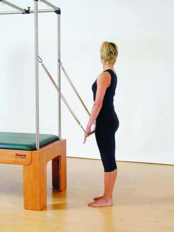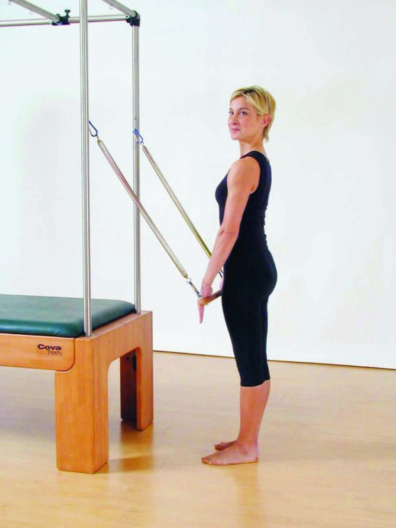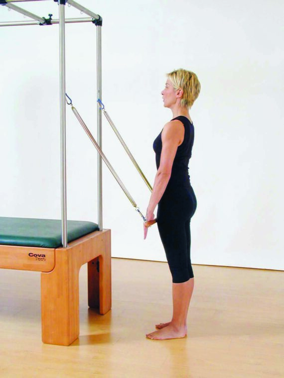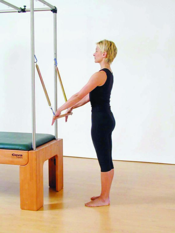 Agganciate al tubo alto (o alla parte superiore dei tubi laterali) uno dei tool della Cadillac: la “roll back bar”, che è una specie di trapezio sostenuto da due tiranti a molla. Le molle devono essere leggere o di media resistenza, secondo il vostro livello di allenamento. Mettetevi di fronte alla macchina con i piedi vicini (talloni uniti e punte ruotate all’esterno), afferrate la barra e tenete le braccia tese davanti a voi. Questa è la posizione di partenza. Inspirando e contrastando la forza delle molle, spingete la barra verso il basso e portatela vicino al corpo, senza piegare i gomiti. Mantenete la posizione qualche secondo, espirando e ruotando il capo a destra e a sinistra, poi fate risalire le braccia e la barra alla posizione di partenza, inspirando. Ripetete il tutto 3-5 volte, controllando la postura e tenendo sempre attica la Powerhouse.