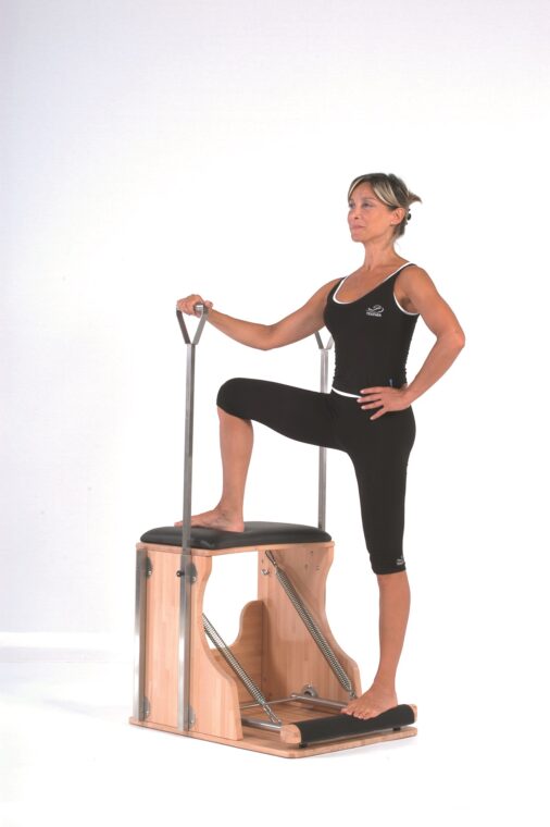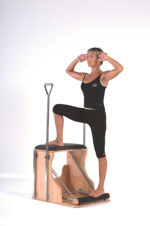 Preparate la Chair con una resistenza medio-alta e posizionatevi di lato. Appoggiate il piede sinistro sulla barra e quello destro sopra alla seggiolina, ruotandolo un po’ verso l’esterno (circa 45 gradi). Posate la mano destra sulla maniglia della barra di sostegno, per aiutarvi nell’equilibrio. Inspirando, spostate il peso del corpo sulla gamba destra ed estendetela, in modo che la barra basculante si sollevi. Espirando ritornate alla posizione di partenza. Ripetete il movimento 3-5 volte per gamba. Attenzione: non aiutatevi nella salita facendo forza sul braccio e non lasciate cadere il busto in avanti: rimanete ben erette.