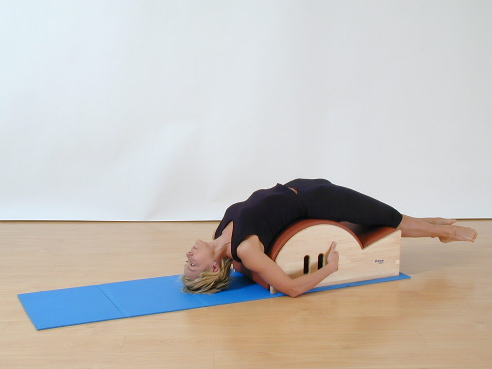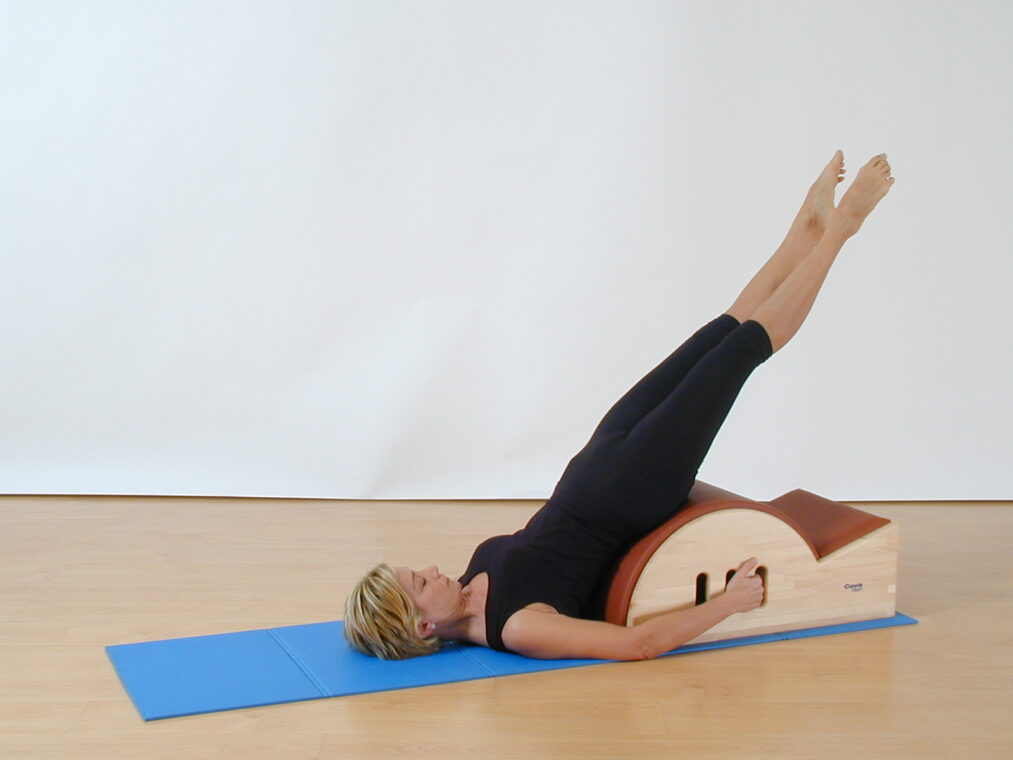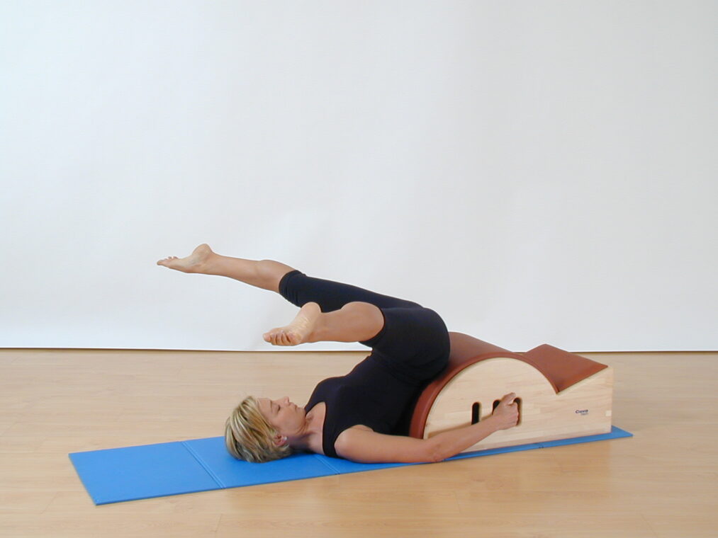Sdraiatevi supine, con le spalle e la parte alta del dorso al suolo, mentre la zona lombare deve essere appoggiata alla parte semicilindrica della Barrel. Portate le gambe, unite e tese, al soffitto, in modo che siano perpendicolari a terra. Espirando, fate scendere le gambe verso il viso, senza staccare la parte bassa della schiena dall’attrezzo. Allontanatele leggermente l’una dall’altra, poi gradualmente divaricatele e disegnate una traiettoria circolare con le punte dei piedi, fino a riunire le gambe dalla parte opposta del viso: in questa fase inspirate e fate in modo di non inarcare la zona lombare nemmeno quando le gambe arrivano ad estendersi. Tornate alla posizione iniziale e ripetete il movimento 3-5 volte, quindi concludete la sequenza con lo stretching: fate scendere i piedi verso il pavimento al di là della Step barrel, in modo che i polpacci siano vicini al gradino, lasciate che la schiena si inarchi e che la testa ricada all’indietro. Questa fase conclusiva può essere anche considerata un esercizio a sé stante, molto rilassante per la schiena (il suo nome è Lower back).