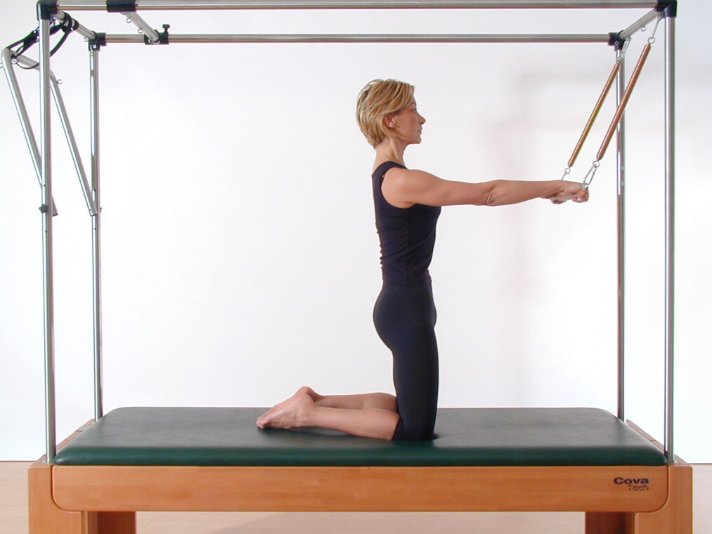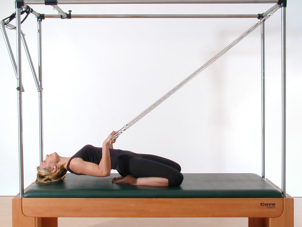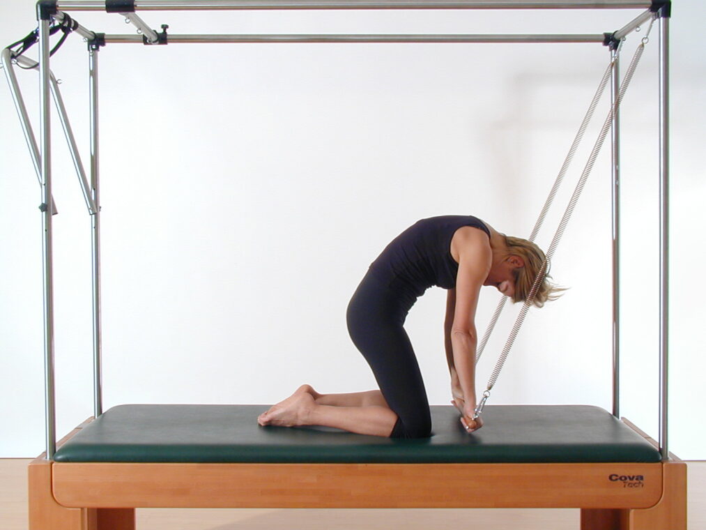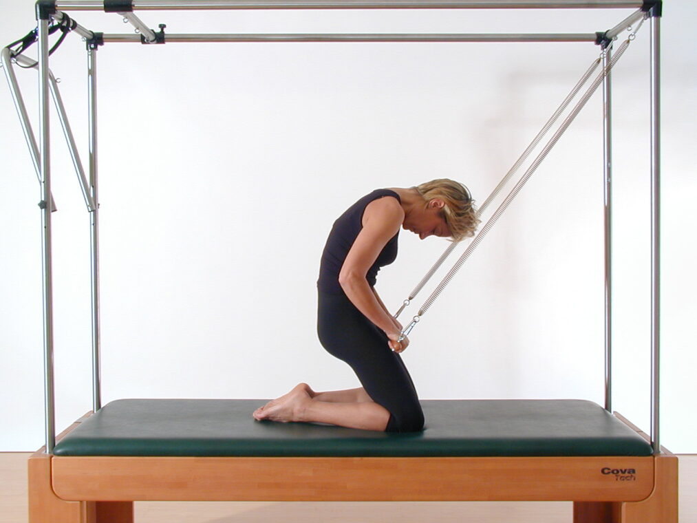 Preparate la macchina e in particolare la barra, cioè la sbarra rigida che si fissa con due molle alla parte superiore della struttura a baldacchino. Usate due molle leggere. Posizionatevi sul lettino in ginocchio, rivolte verso la barra, e afferratela in modo che le braccia siano tese. Inspirando, attivate gli addominali, eseguite una retroversione del bacino e create la “C-shape” (cioè la curva a C della schiena). Contemporaneamente abbassate le braccia. Espirando avvicinate le mani alle ginocchia, senza piegare i gomiti. Facendo attenzione a non “perdere” la C-shape, inspirate e portate i glutei sui talloni, flettendo contemporaneamente le braccia e facendo scivolare la barra contro il corpo, fino a portarla all’altezza dello sterno. Le anche sono sempre estese e tutta la parte superiore del corpo si inclina all’indietro: quando avete raggiunto la vostra massima estensione possibile, espirate ed estendete le braccia davanti al petto, per poi risalire alla posizione di partenza. Lavora attivamente tutta la catena muscolare anteriore. Ripetete la sequenza 3-5 volte. L’esercizio si può eseguire anche nella variante “reverse” (Rolling out), inclinando all’indietro il corpo a braccia tese (in questo caso bisogna mantenere le curve fisiologiche della colonna vertebrale): poi piegate le braccia, portando la barra allo sterno, create la C-shape, risalite ed estendete le braccia davanti al petto.