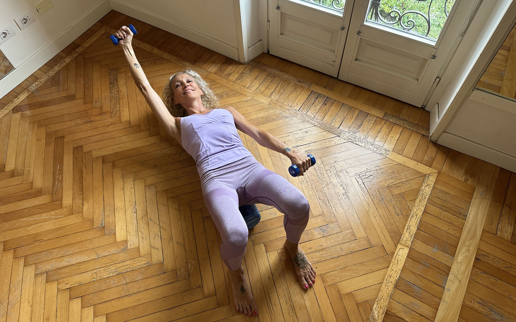Per eseguire l’esercizio vi servono 2 manubri da un chilo, oltre a uno dei tool che si usano nel Matwork: il Foam roller, un cilindro in materiale espanso, disponibile in versioni diverse, più duro o più cedevole, che funge da supporto instabile e costringe ad attivare in modo profondo i muscoli stabilizzatori del corpo. La sequenza ha l’obiettivo di tonificare i muscoli anteriori e posteriori del cingolo scapolo-omerale (pettorali, deltoidi, gran dorsali) e, per le principianti, può essere eseguita anche senza l’uso del roller, cioè con la schiena sul tappetino.