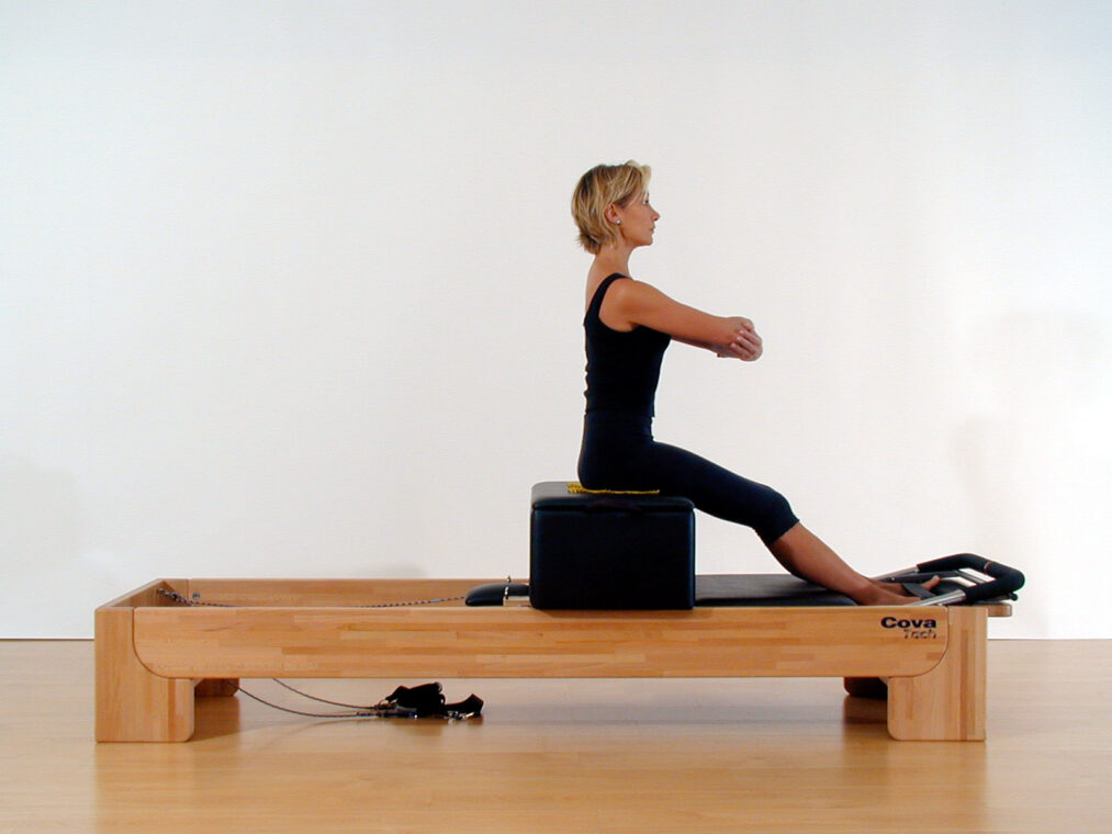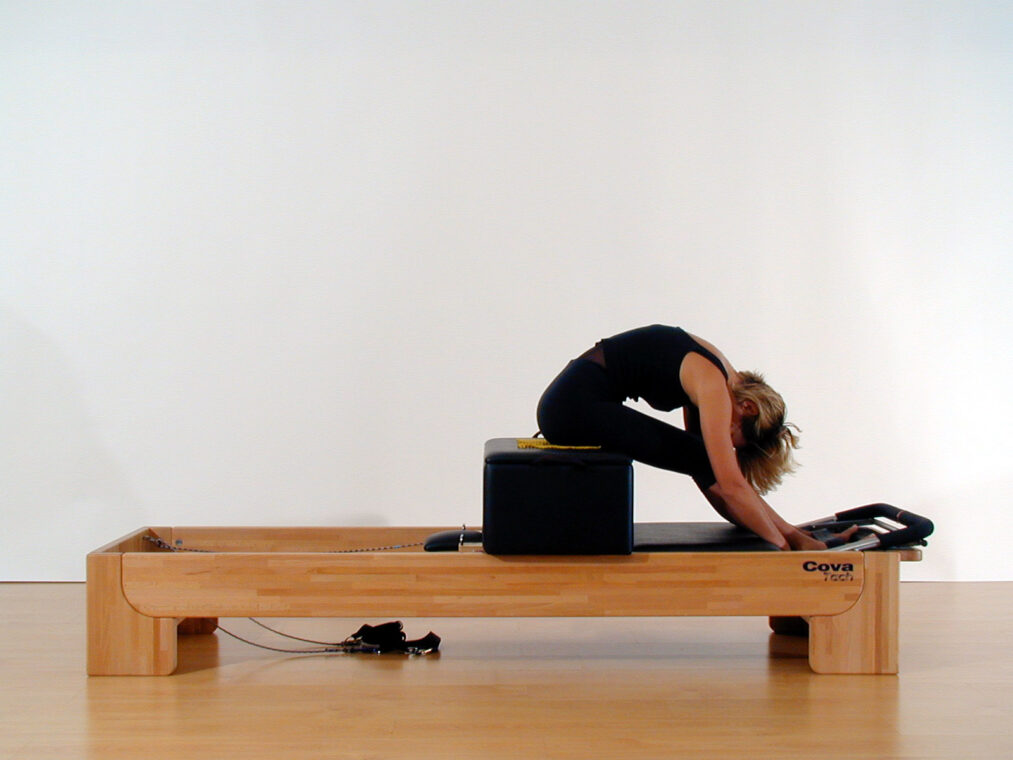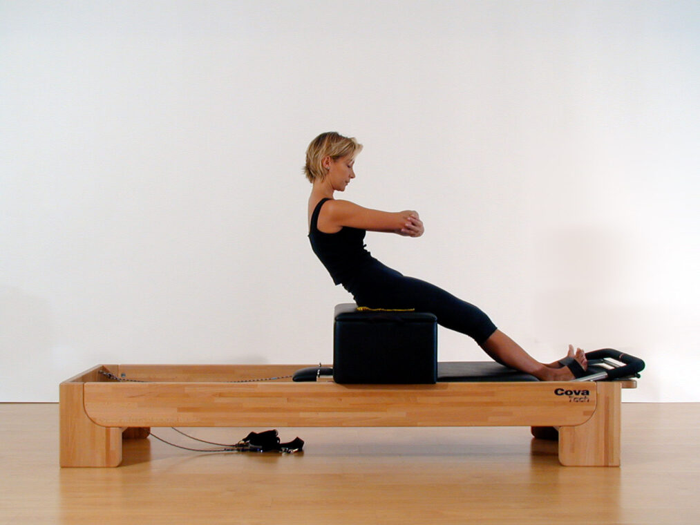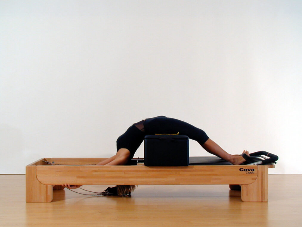 Abbassate la barra poggiapiedi e posizionate il box (il parallelepipedo di supporto per il corpo) trasversalmente sulla pedana mobile. Agganciate 2 molle e sedetevi al centro del box, con le gambe tese e i piedi infilati nella cinghia ferma-piedi, posta vicino alla scatola delle molle. Il busto è eretto e le braccia sono conserte. Espirando, inclinate il busto all’indietro, inarcando la schiena in modo da farle assumere una forma a C. Inspirate, poi espirando fate risalire il busto e flettetelo sulle cosce, chiudendovi a libro, fino a portare la fronte alle ginocchia. Ripetete 3-5 volte questo movimento di preparazione, poi passate a eseguire l’esercizio completo: quando fate scendere il busto all’indietro, arrivate ad allungarvi completamente, appoggiando la nuca al poggiatesta, inarcando la schiena e portando le braccia ai lati della testa. Poi risalite e flettete il busto sulle cosce (come nella fase di preparazione). Eseguite la sequenza 3-5 volte.