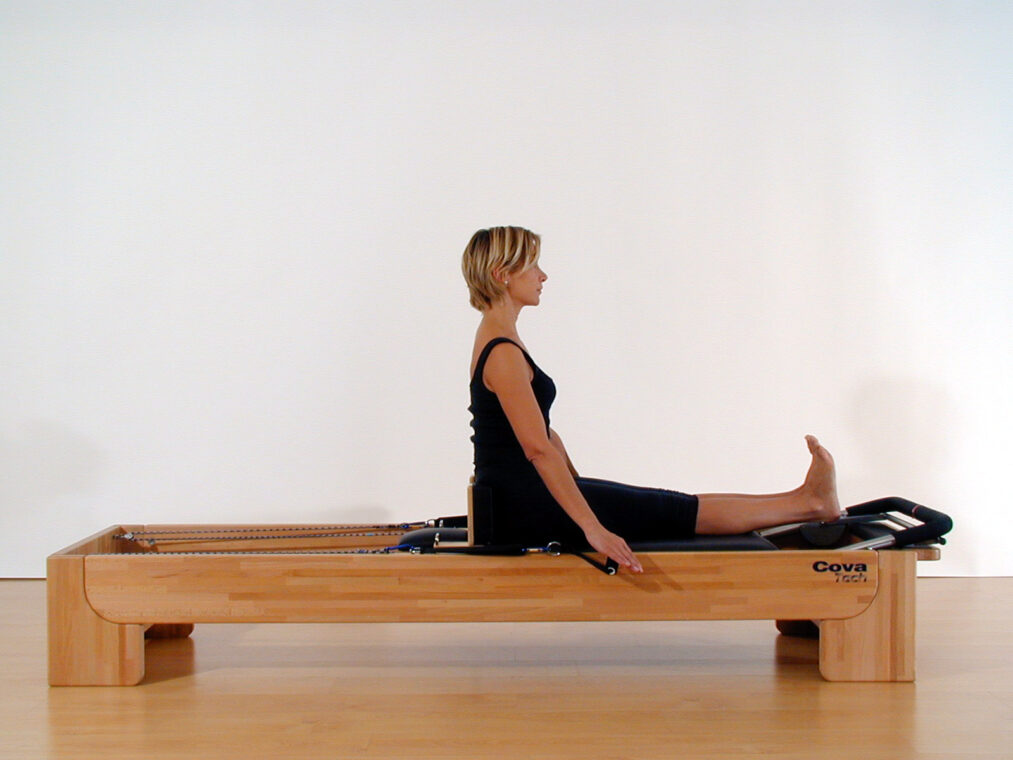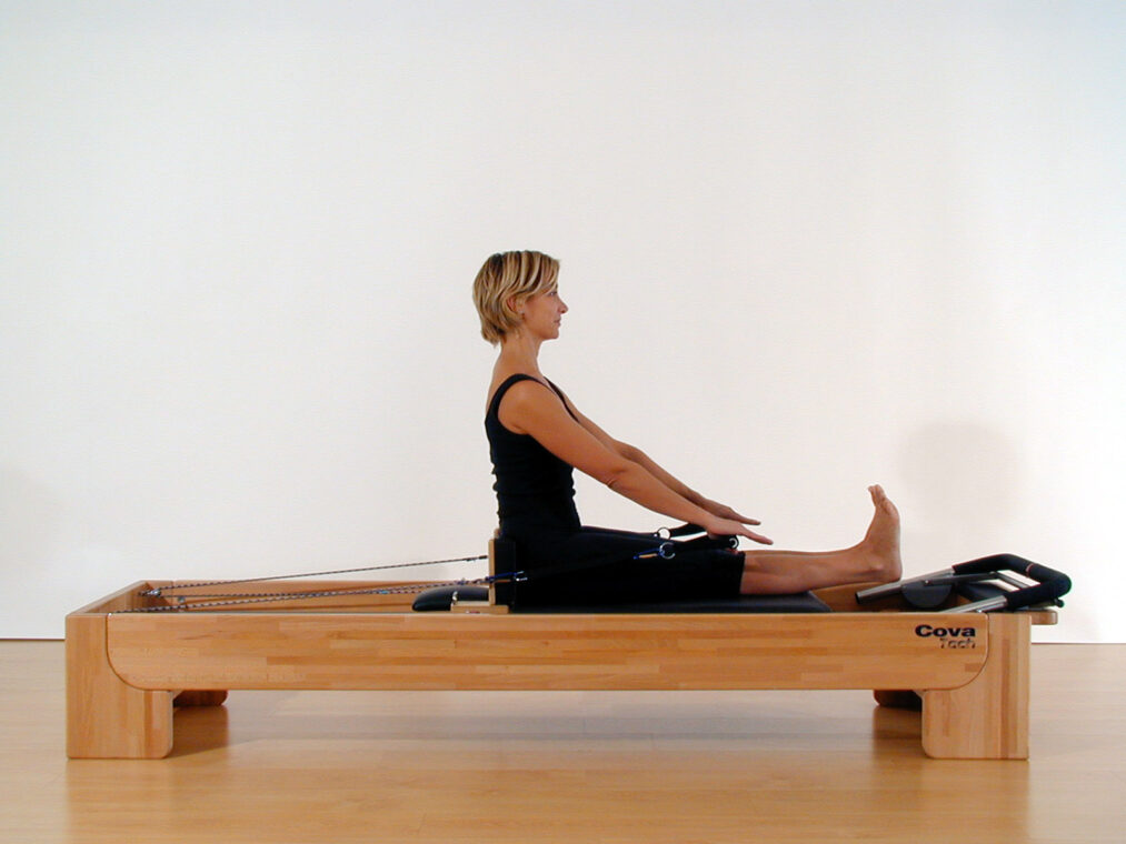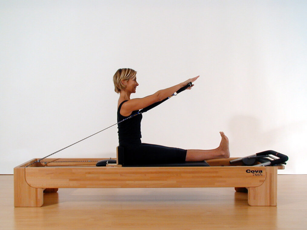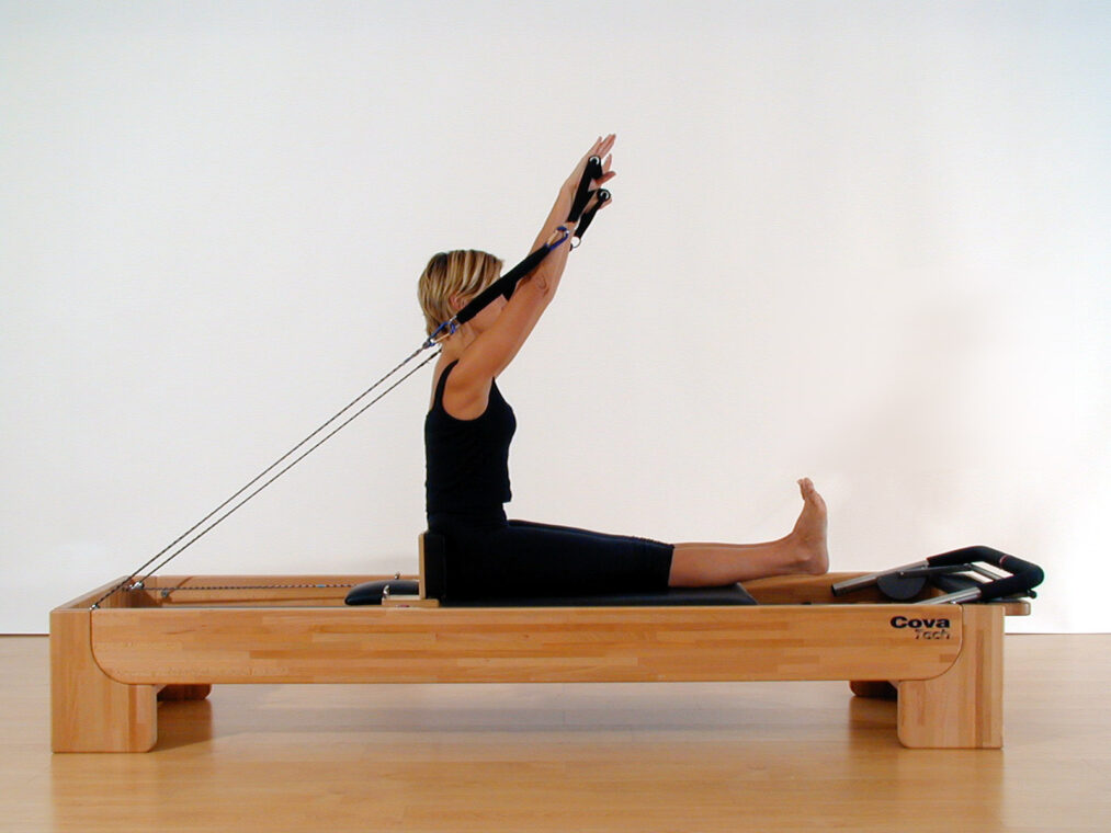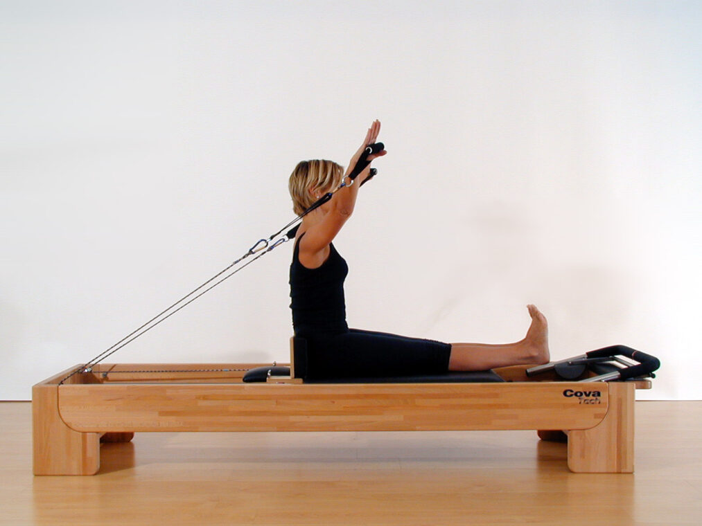 Anna Maria Cova, fisioterapista e fondatrice della CovaTech Pilates School, ci spiega come eseguirla. Preparate il Reformer con una molla come resistenza e sedetevi sulla pedana scorrevole, con il viso rivolto verso la barra poggiapiedi (che avrete preventivamente abbassato). Le gambe sono tese, i piedi a martello, i gomiti flessi e stretti al busto, le mani afferrano le maniglie delle cinghie. Inspirando, estendete le braccia fino a portare le mani all’altezza degli occhi. Espirando abbassate le braccia, mantenendole tese, poi inspirando alzatele entrambe ai lati del capo. A questo punto allontanate le braccia l’una dall’altra, fatele scendere ai lati del busto (disegnando un ideale cerchio) e flettete i gomiti per riportarvi alla posizione iniziale. La fase di discesa è accompagnata dall’espirazione. Ripetete la sequenza 3-5 volte, controllando l’attivazione addominale continua ed evitando che le spalle si avvicinino alle orecchie.