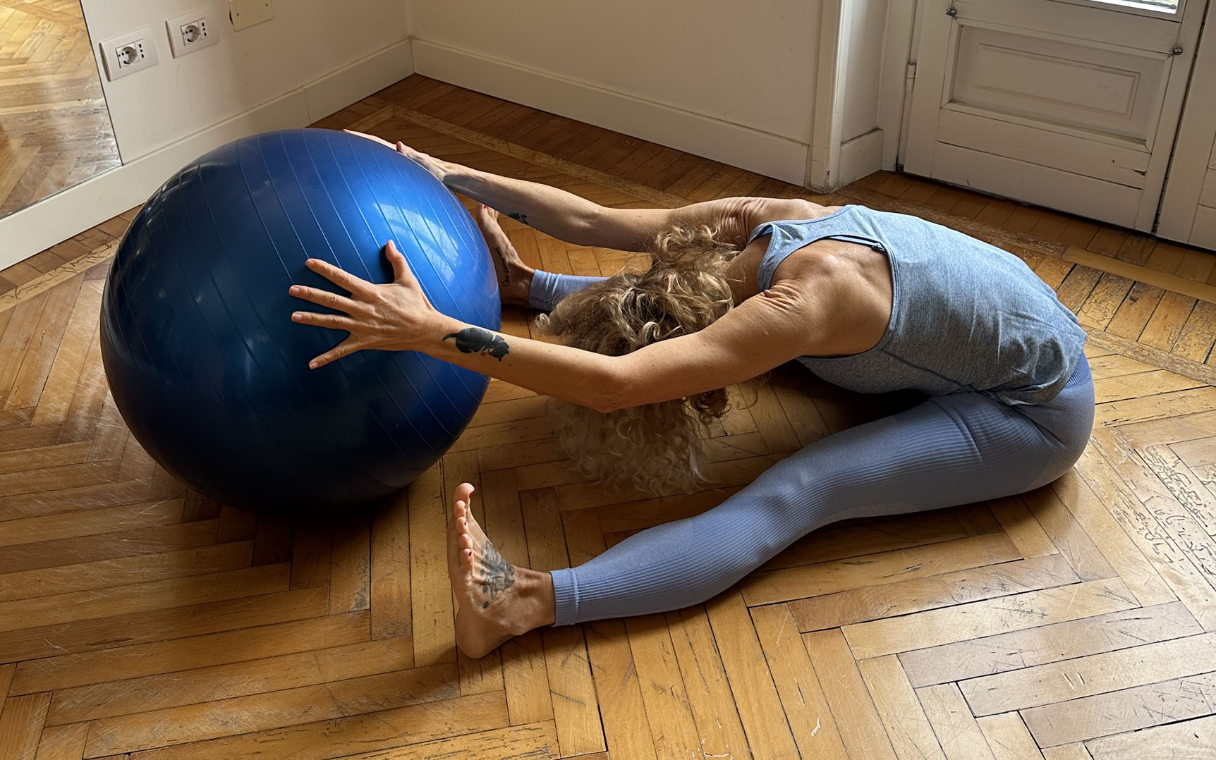 La palla grande, che in altre sequenze serve per aumentare l’intensità del lavoro con la sua instabilità, ha qui soltanto un ruolo di supporto per facilitare il movimento.