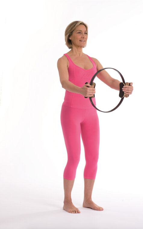 Ci sono due esercizi del Matwork che potete effettuare anche a casa, senza l’ausilio del Reformer, e che riproducono il movimento allenante dell’abbraccio con due diverse inclinazioni. Fanno parte delle cosiddette Standing series, le serie in piedi, si eseguono con la palla morbida o con il Magic Circle e prendono nome dall’altezza a cui l’attrezzo viene tenuto: Belly (ombelico) e Shoulders (spalle). Siete in posizione eretta, con le gambe appena divaricate e l’attrezzo tenuto davanti al corpo fra le mani (gomiti lievemente piegati). Dovete stringere l’attrezzo fra le mani, espirando, e mantenere la tensione per almeno 3 secondi, prima di rilassare le braccia. Il tutto viene ripetuto 5 volte. Se siete più comode, potete eseguire il movimento anche da supine o da sedute.