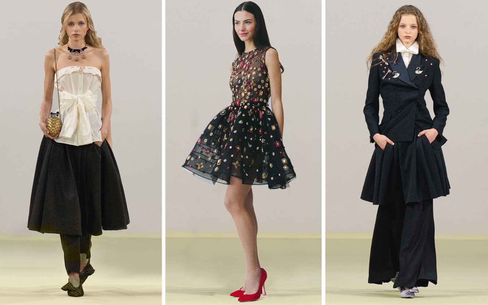 C’è poi il cigno, simbolo di grazia e metamorfosi, che attraversa abiti e accessori in ricami tridimensionali vellutati, su guanti, maschere e scarpe. L’argenteria britannica settecentesca diviene una stampa e si trasforma in gioiello, mentre brocche a forma di cigno vengono posate intrecciate come orecchini. L’uovo si carica di significato trasformandosi idealmente volto umano. Invece i tovaglioli piegati si evolvono in coccarde tridimensionali applicate su mini abiti e pantaloncini, poi replicate in metallo come spille e mini bag gioiello.