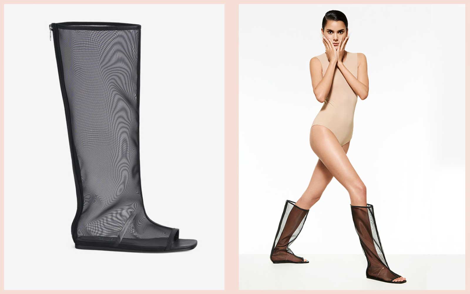 I modelli più audaci giocano sulla trasparenza: la sneaker bianca see-through, lo stivale-sandalo nero ultra-flat a punta aperta con struttura grafica, e gli over the knee effetto seconda pelle su tacco affusolato da 9 cm, presentati nelle nuove tonalità essenziali di cipria e polvere.
